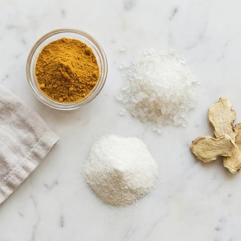 Kurkuma-Saft aus Konzentrat, hydrolysiertes Kollagen Typ 1, 2 & 3 (enthält die Aminosäuren: L-Glycin, L-Prolin, L-Alanin, L-Hydroxyprolin, L-Glutaminsäure, L-Arginin, L-Asparaginsäure, L-Serin, L-Lysin, L-Leucin, L-Valin, L-Threonin, L-Phenylalanin, L-Isoleucin, L-Hydroxylysin, L-Methionin, L-Histidin, L-Tyrosin, L-Cystein), Säureregulator (Citronensäure), Vitamin C, MSM (Methylsulfonylmethan), Glucosaminsulfat, Chondroitinsulfat, Hyaluronsäure, Aroma (natürliches Aroma), Konservierungsstoffe (Kaliumsorbat, Natriumbenzoat), Farbstoff (Süßkartoffelpulver), Süßungsmittel (Sucralose, Acesulfam-K), Selen, Vitamin D.
